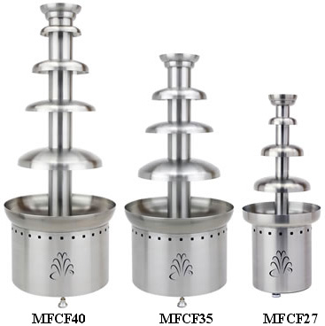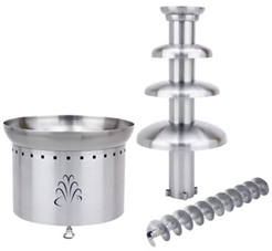 Set up takes only minutes and operation could not be easier. The heavy duty fountain maintains the chocolate at an ideal temperature (approx 105-110°F = 45 — 50°C ). Our precision stainless steel auger re circulates the warm chocolate up through the fountain and back down over the stainless steel tiers.